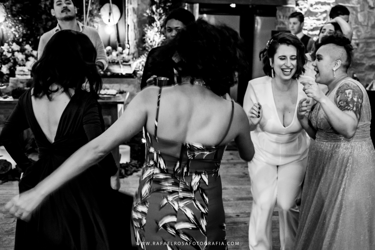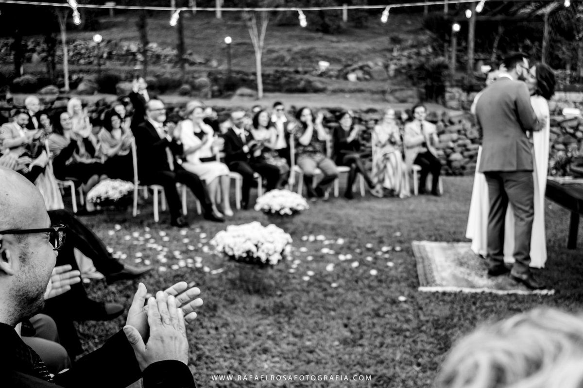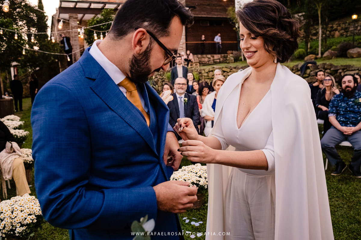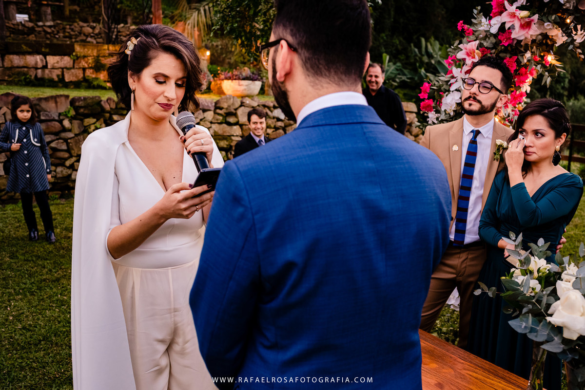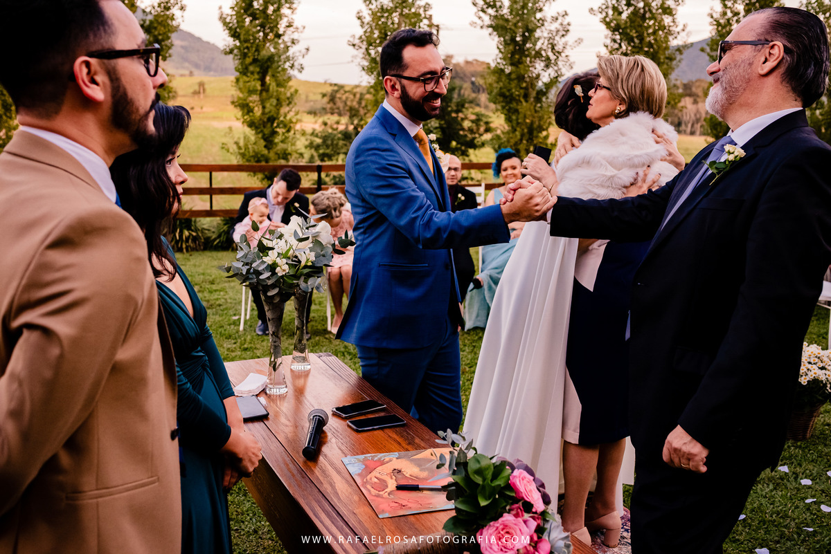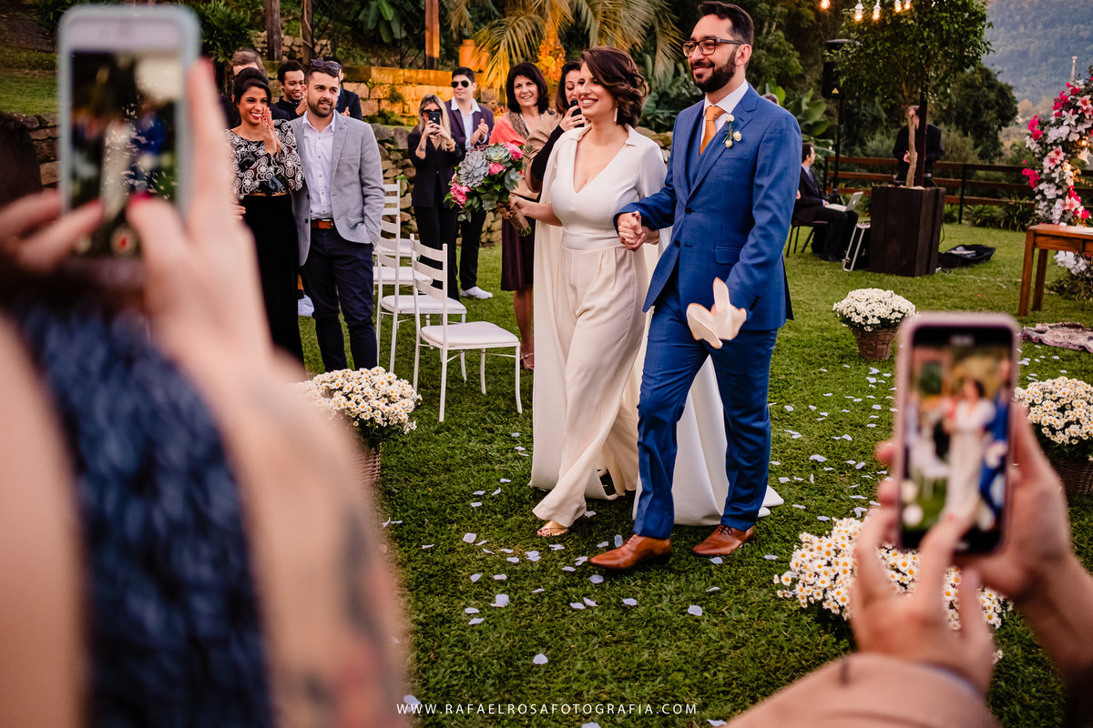 A celebração dessa união não poderia ser diferente deles, a começar pelo "vestido" da Lê - um macacão com um capa linda, casamento de dia, a entrada deles juntos, afinal estavam entrando numa nova etapa da vida juntos, um dia lindo, um casal conectado, famílias lindas e acolhedoras. O sorriso e a lágrima. Os amigos celebrando essa união. O pôr do sol.